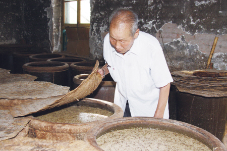 郝恩和进入酿醋作坊开始学艺的时候只有16岁,虽然年龄不大,但每天从早到晚都要进行翻缸、嗅气味、看色泽等工序,看似简单的事情他一学就是三年。因为只有反复锤炼,才能把握我们这些“老西儿”的口感和风味,酿造出原汁原味的独流老醋。郝老常和年轻的后生们说:“那个时候可不像科学技术发达的今天,物理、化学都没学过,酿醋完全得凭着自身经验积累。所有的酿醋工序要靠人工来完成,任何一个环节都不能出问题,否则就酿不出独流老醋来。”