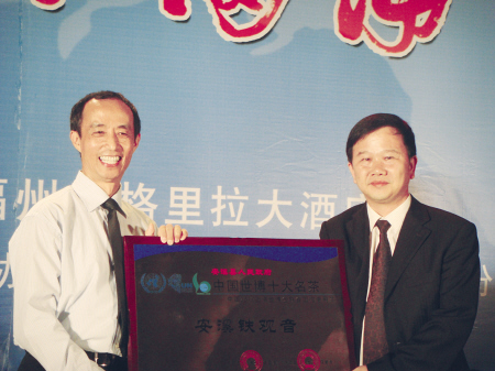 11月8日,中国世博十大名茶招管会主任黄汉庆在福建安溪向安溪县人民政府县长陈灿辉授予“安溪铁观音”茶入选中国世博十大名茶牌匾和证书。