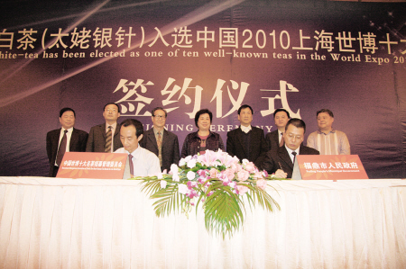 11月14日,值此第三届海峡两岸茶业博览会在宁德召开之际,福鼎分会场则迎来了“首届中国太姥山资国寺禅茶文化国际研讨会暨第四届世界禅茶文化交流大会”。美丽的太姥山此时分外妖娆,传说中太姥娘娘令茶仙子特意采摘一片“太姥银针”正从远古向我们走来,似乎期待着一个能令太姥山一个世纪震撼的特大喜讯的到来。果不出太姥娘娘所料,在当晚的宴请仪式上,中国世博十大名茶招管会、中国世博十大名茶活动组委会主任黄汉庆代表2010上海世博会联合国馆与福鼎市人民政府陈其春市长签署了“太姥银针”白茶准入联合国馆专用茶协议,同时进行的还有授牌和授证书仪式。来自全国各地的行业社团组织、茶学专家共300余人见证了本次签约仪式。至此,中国世博十大名茶在太姥山震撼收官。本次签约活动由福鼎市委书记倪正云主持,中国世博十大名茶活动组委会主任黄汉庆和宁德市政协主席姚智梅分别致辞。中国世博十大名茶招管会顾问刘启贵宣布福鼎白茶入选决定,副主任于观亭向福鼎市人民政府陈其春市长颁发证书,副主任舒曼宣读授牌牌记。 (江南人)