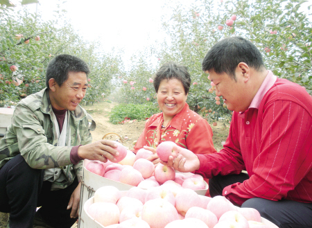 目前,该镇在当地信用社的大力支持下,发展优质水果基地2万亩,仅苹果一项果农人均收入可达3万元。望着满园红彤彤的苹果,果农的心里乐开了花。图为该社信贷人员在刘合昇夫妇的果园进行贷后回访。 宋佳林 李晓莉 摄
