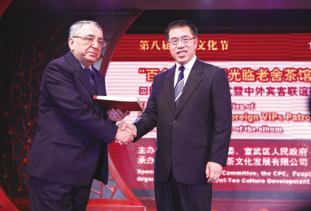 活动中,阿塞拜疆、立陶宛、毛里求斯、尼泊尔、斯洛文尼亚、乌克兰驻华大使,摩尔多瓦临时代办接受了中央、北京市、宣武区领导馈赠的其国家元首政要曾光临老舍茶馆的照片和画册。