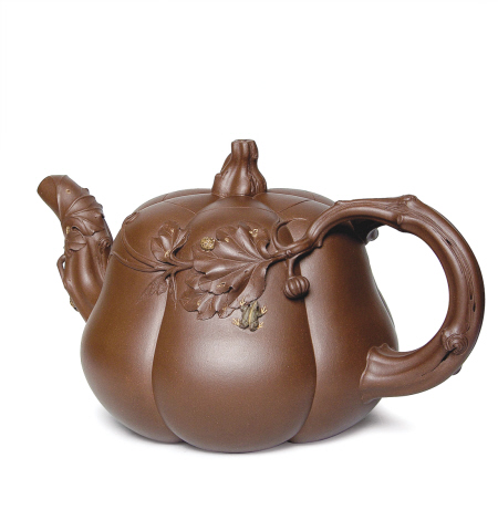 声名鹊起的范黎明不骄不躁,不懈不怠,乐与紫泥为伍,并愈加富有创新精神,“农家乐园”就是其近几年来所推出的花货新作。该作品坚持其一贯的纯手工制壶风格,超高难度的收腰南瓜器形彰显其非凡的制壶功力,壶把壶嘴枝蔓遒劲、线型流畅,壶身须叶惬意伸展、生动洒脱,洋溢着世外桃源式的闲情雅致,田园风光跃然壶上,而菜园里青蛙与瓢虫的灵动身形,更把观者带入了一幅生机盎然的中国花鸟画卷。该壶在运势、布局方面也展现了作者深厚的美学功底,壶嘴壶把气势相承,壶身布置在变化中为全壶助势,因而硕大的器形在稳重大气中透出古典气韵,在生动流畅中折射出现代审美意味,不愧为紫砂花货中的上乘力作。(《农家乐园》器形分大、中、小三种,北京紫艺经贸有限公司长期对外作全方位展示)