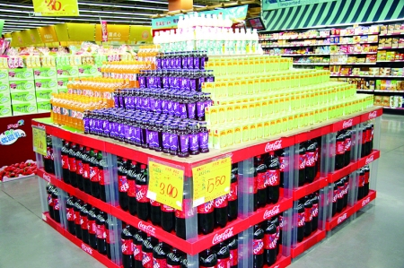 | 将不同品牌的饮料恰如其分地搭成金字塔造型,赚足顾客眼球。 |