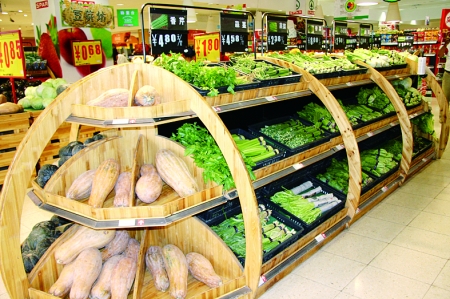 | 蔬菜按需而“列”,一改传统超市蔬菜区域杂而乱的现状,木制货架的优势一览无余。 |