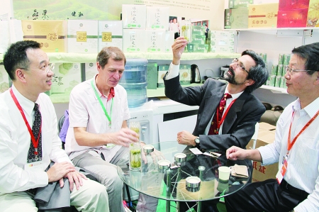 图二:美国耶鲁大学教授(右二)对中国绿茶很感兴趣。他仔细观察杯中的东裕茗茶,并询问了种植及加工情况。 张永立 摄