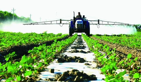 当前,新疆生产建设兵团农七师全力以赴加强70万亩棉花的田间管理,合理运用水肥,促苗稳健生长,为棉花丰产搭好架子。图为一辆机车在农七师一二六团三连的棉田里进行叶面施肥作业。孟庆忠 新云 摄
