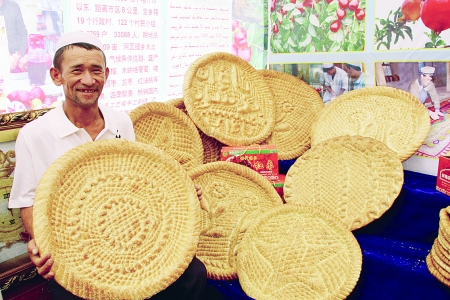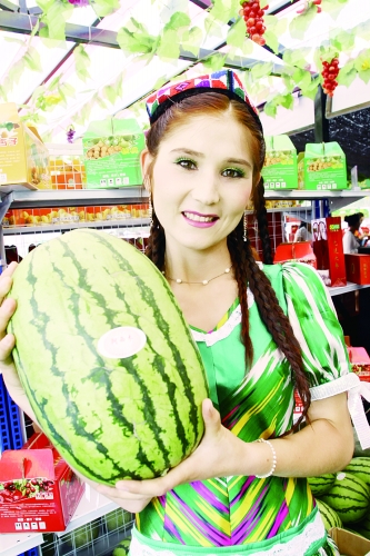 通过喀交会这一窗口,当地的伽师瓜、无花果、杏干、孜然等干鲜果品、农产品已经畅销北京、广东、上海等国内市场以及巴基斯坦、土耳其、伊朗、吉尔吉斯等国际市场。图为喀交会上农民们正向客商展示农产品。