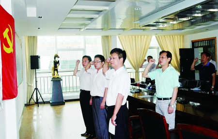 该行来自基层支行一线新老党员干部一起接受了党员教育,全体党员表示要以竹山农商行组建为契机,落实好党员“四个一”活动,即在本单位中树立一面旗帜,在本岗位上当好一个模范,在员工中做好一个标兵,在一线上勇当一个先锋。图为新老党员宣誓活动现场。胡奎 王林 图/文