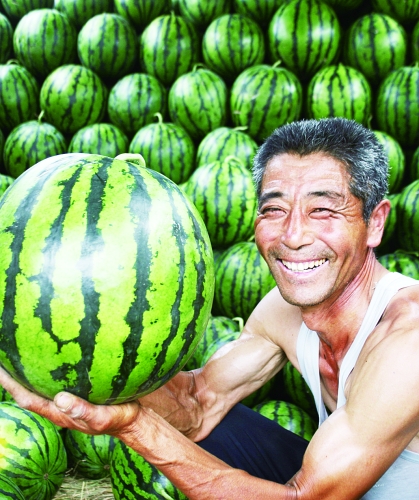 图为李中村瓜农杨绍年捧着自家产的西瓜喜笑颜开。今年他种植了20亩西瓜,纯收入将达到5万元。