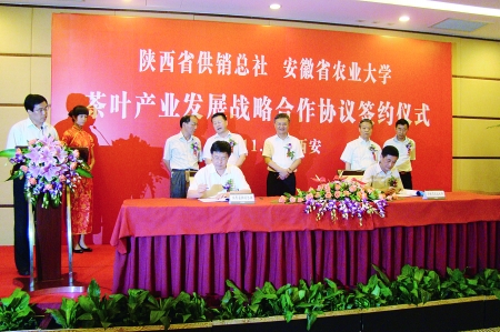 陕西曾是茶马互市贸易中心和全国八大茶区之一,安徽农业大学系我国茶学科重点院校,这次陕西省供销社与安徽农业大学签订战略合作协议,将利用陕西省雄厚的茶产业资源和悠久的产茶制茶历史文化,依托安徽农业大学茶学专业人才、科研实力雄厚的基础,为陕西省培养专业技术和管理人才,提升改造老化茶园,打造品牌知名度,延伸产业链,从而加速茶产业升级换代。陕西苍山茶业公司等省茶产业龙头企业也分别与安徽农大签订了校企合作协议。