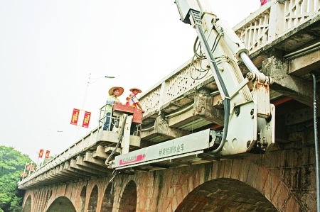 图为 8月7日,在广西桂林市恭城瑶族自治县县城茶江大桥下,技术人员使用桥梁检测作业车给大桥“体检”。