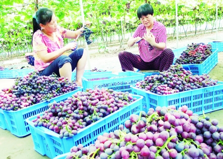 今年提子上市之际,安徽省芜湖市三山区格林美提子合作社与苏果超市签订“农超对接”协议,使新鲜提子直供超市,减少了中间环节,解决了果农后顾之忧。图为果农在整理发往超市的提子。 程依宝 摄 (cnsphoto 供图)