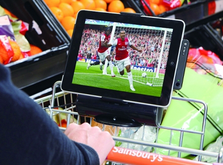 英国Sainsbury's超市日前在其Kensington Cromwell Road分店开始试用带iPad的购物车。每台购物车都装有一个iPad架子、Speakers和防盗感应器,只要一拿下iPad,购物车就会响。据了解,如果反映良好,Sainsbury's将带iPad的购物车推广到整个英国。