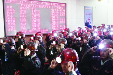 图为2011年11月23日,安徽淮北矿业集团岱河矿业公司矿工等待入井,跟踪定位系统在候罐室墙上的大屏幕上自动滚动显示入井人员信息。