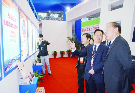 图为11月9日上午,安徽省农村信用社联合社主任陈鹏(图一右)陪同省金融办主任周建春(图一左)在“安徽农金”展台前参观。