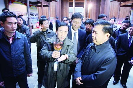 在歙县徽州府衙参观考察时,代表们的茶杯里泡着朵朵盛开的黄山绿牡丹等工艺造型茶,是茶艺专家、工艺造型茶博物馆策划人汪芳生发明的。一行走到摆设在徽州府衙内的芳生茶业展区前,见一朵“前程似锦”的工艺造型茶在透明的玻璃杯中绽放。王三运停步察看并饶有兴趣询问工艺造型茶博物馆馆长汪徽州工艺造型茶的制作工艺。汪徽州馆长说:“现在国家大力发展文化强国,也给我们的茶企业带来前程似锦,作为徽州人更有责任将茶叶与徽州文化有机结合,提高它的附加值。为什么叫前程似锦呢?因为这朵茶叶下面是用黄山高山的云雾茶满天香,上面这朵红色的花是康乃馨,泡开后,似一朵盛开的牡丹,寓意前程似锦。还有锦上添花、神龙、孔雀开屏等类似这样的造型茶已经发明了600多种。”王三运对工艺造型茶融入文化给予充分肯定和高度评价,他说:“工艺造型茶很具有文化内涵,安徽要打造文化强省,需要这样的企业文化。”