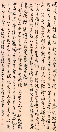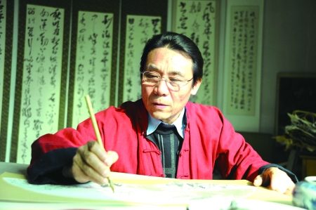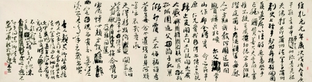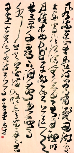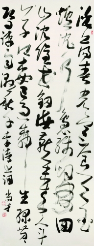 尚才先生书法创作以清逸明净直追晋韵的小行草为尚。其书法作品连续入选第六、七届全国书法展和第六、七、八届全国中青年书法篆刻家作品展。2009年,先生以年近花甲之龄,仍入展第三届《兰亭奖》,成为此展年龄最大、书协职务最高的参展作者。在荣誉面前,先生没有唯恐丢却既得荣誉开始守成,而是选择了变法和向更高境界的突破。他那骨子里山东豪杰之气与燕赵慷慨之风在胸中久久蓄储,寻找爆发表现的突破口。他把目光投向了唐代旭素浪漫狂草和明清高堂大轴。无疑旭素是盛唐精神的代表,但其过于强调中锋用笔环环缠绕则势见单薄;明清王铎、傅山纵巨幅视觉震撼,但其行草夹杂,笔墨线块交错亦失典雅细腻。能否用晋书的用笔精致明净和唐代的激情飞扬、纵横开阖和明清巨制形式幅式相结合,融合洗练出一种既清逸明净,又奔放飞扬、视觉冲击感人的新书风形式呢?李尚才先生开始尝试,开始摸索,很长时间他淡出了众人竟相露面曝光和炒作的闹市,甚至离开生活多年的河北省会石家庄,而隐居山东老家,其朝思暮写,除了纸墨和妻子温馨的生活照顾,他几乎达到了与世隔绝的地步。苦恼、欣喜、徘徊、激奋,经过长时间的闭关修炼,他终于成功了。还是精雅清逸、顿挫明净、八角出芒的晋人笔法,但结字章法更显大起大落、大开大合,加及明清顿挫起伏对比夸张的墨色变化和外在巨幅形式,一种明快、跳掷、秀逸而雄浑、明净而气满、俊雅而激荡的大草书风形成了。其纤纤处如新绿发芽,雄放处如崩云块垒,其紧凑处如快马疾蹄,碎笔点阵,疏放处如猛虎长啸,纵笔直拓。其书作中每每有一提神字眼,婉如李娜《青藏高原》那嘹亮之长音,读之令人激奋、快然、神逸。这是源于经典传统而又突破传统熔铸时代精神的创新之作。先生在年近花甲之年于第三届《兰亭奖》的再次折桂,标志着其变法的成功实现和华丽转身。