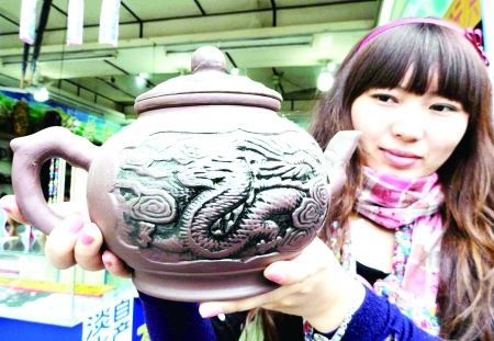 随着龙年的到来,江苏苏州市东北街一家茶壶店推出多款龙年主题紫砂茶壶,受到消费者的青睐。图为龙年元旦这天,在苏州东北街一茶壶店,顾客展示龙年主题紫砂茶壶。 王建康/摄