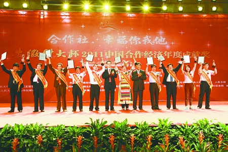 本报讯 (记者 任智超) 5月19日晚,“安徽财大”杯2011“中国合作经济年度成就奖”颁奖典礼在安徽财经大学体育馆隆重举行。白志刚等35人获“中国合作经济年度人物奖”、北京“兴满园”牌农副产品等20个品牌获“中国具有影响力合作社产品品牌”奖、北京东旭旺养殖专业合作社等50个合作社获“中国50佳农民专业合作社”奖。受全国供销合作总社党组书记、理事会主任杨传堂同志委托,总社党组成员、理事会副主任李春生出席颁奖典礼并讲话、为获奖者颁奖。颁奖典礼上主办方与安徽财经大学共同推出了《2011中国合作经济发展年度报告》,并公布了“2011年中国合作经济十件大事”。