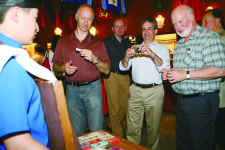 晚宴过后,在茶馆工作人员的讲解下,客人们参观了老舍茶馆经营场所。大碗茶琴清脆悦耳的声音令瓦尔格莫女士非常兴奋,她与王宁边上楼边和着碗琴的伴凑愉快地唱起了电影《音乐之声》的插曲《哆来咪》。在老北京传统商业博物馆,国家大剧院院长陈平在大碗茶摊面塑前如数家珍一般地向瓦尔格莫女士讲起了老舍茶馆的创业历程。“蜜来……冰糖葫芦……”,“磨剪子嘞,戗菜刀”,听到这些京味十足的吆喝声,看到伙计们蓝衣黑裤瓜皮帽的传统打扮,瓦尔格莫女士赞美道“太棒了,我非常喜欢”。看着扮演“剃头匠”的伙计手中拿着的“唤头”,瓦尔格莫女士感到十分好奇,她忍不住接过“唤头”,在“剃头匠”的指导下比划了起来。