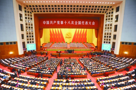 人民大会堂雄伟庄严,万人大礼堂气氛热烈。主席台上方悬挂着“中国共产党第十八次全国代表大会”的会标,后幕正中是镰刀和锤头组成的党徽,10面鲜艳的红旗分列两侧。二楼和三楼的眺台上分别悬挂着“高举中国特色社会主义伟大旗帜,以邓小平理论、‘三个代表’重要思想、科学发展观为指导,坚定不移沿着中国特色社会主义道路前进,为全面建成小康社会而奋斗!”“伟大、光荣、正确的中国共产党万岁!”的横幅。在主席台前排就座的大会主席团常务委员会成员有胡锦涛、江泽民、吴邦国、温家宝、贾庆林、李长春、习近平、李克强、贺国强、周永康、王刚、王乐泉、王兆国、王岐山、回良玉、刘淇、刘云山、刘延东、李源潮、汪洋、张高丽、张德江、俞正声、徐才厚、郭伯雄、李鹏、朱镕基、李瑞环、宋平、尉健行、李岚清、曾庆红、吴官正、罗干、范长龙、许其亮、何勇、令计划、王沪宁。