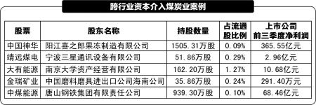 不过,看好煤炭业的跨行业资本并不仅仅是喜之郎一家企业,近期,有不少和煤炭业毫不挨边的企业对煤炭青睐有加,宁波三星通讯设备有限公司成为靖远煤电第七大流通股股东;中煤能源的股东名单中出现了唐山钢铁集团有限责任公司;南京大学资产经营有限公司也刚刚成为大有能源的流通股股东。