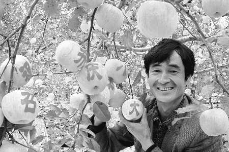 陕西省延安宝塔区临镇镇任家塬村300多口人,常年种植苹果,2700多亩耕地全是果树。该村果农王军宏“庆祝十八大胜利召开”等贴字苹果成为延安陕北黄土高原上一道独特的风景线,他的贴字苹果代表了陕西广大果农对党的十八大召开的衷心祝福。图为王军宏与他的贴字苹果。 杨永祥 摄