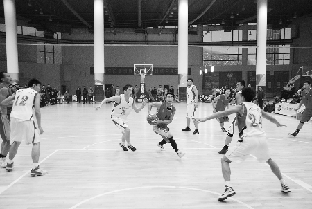 在17日举行欢迎庆功会上,新疆供销合作社领导表示,将把这支劲旅篮球队升格为新疆供销合作社篮球队,全力支持这支企业文化劲旅的进一步发展。图为决赛现场,深色服装为新疆农资队。 、