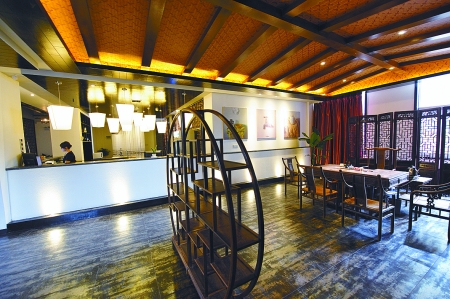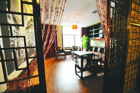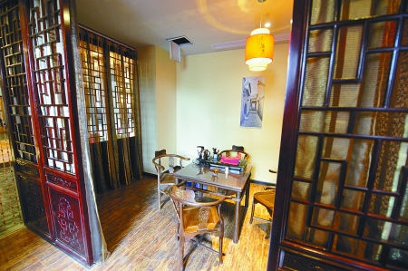 记者漫步在茶楼中,最直接的感受是中西结合的装饰风格。茶楼大堂采用西式的简洁手法,厅堂的墙是白色的,上面悬挂几幅颇具现代感的油画。吧台位于厅堂中部,采用开放式格局,吧台的吊灯也是白色的,造型比较现代。包厢采用中式的元素更多一些,如茶具、茶座都是中式的,灯是桔红的灯笼,在墙壁采用了一些现代的手法,如用鹅卵石砌成的墙壁,既质朴又时尚。