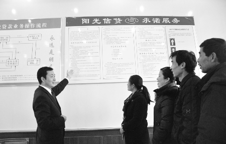 河南修武农村商业银行通过开展“阳光信贷工程”,积极改进服务方式,优化信贷服务环境,让贷款更加便利、透明。不仅让更多的小微企业和农民享受到了便捷的金融服务,也树立了该行良好的社会形象。图为客户经理为前来咨询的农户进行业务讲解。冯海涛 图/文