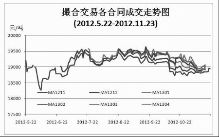 当周撮合有以下特点:一、成交总量微幅增加20吨。当周MA1211和MA1303成交量分别增加3420吨和3520吨,新合同MA1305成交1520吨。MA1212、MA1301、MA1302和MA1304成交量分别减少1940吨、1760吨、1740吨和3000吨。二、订货量减少;当周订货量继续减少,减少的原因主要是MA1211交割前大量减持,其余各合同有增有减,但变化量不大。三、均价以上涨为主。从日均价看,各合同有涨有跌,但总体来看,上涨的幅度大于下跌的幅度。从各合同周均价看,新合同22上市,23日微幅小跌。此外MA1303合同周均价跌10元/吨,其余合同均有不同程度的上涨,涨35-101元/吨不等。四、技术上,当周撮合中心上移,但仍未摆脱弱势震荡的趋势。