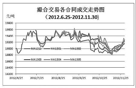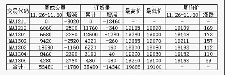 当周撮合特点:一、成交总量减少1780吨。当周MA1302和MA1303成交量分别减少2520吨和1160吨,合同MA1305成交量增2760吨至4280吨;其余合同周成交量增2280—2500吨不等。二、订货量减少。订货量延续减少之势,减持量较大,其主要因为MA1211合同交割。总的来看,维持近月合同减持、远月增持的格局,但从目前仍在交易合同来看,除了MA1301的订货量减少1260吨,变化相对较大外,其余合同订货量变化不大。三、均价上涨。从日均价看,当周以上涨为主,且部分交易日涨幅可观。从各合同周均价看,各合同的价格均有上涨。总体来看,近月涨幅大于远月上涨幅度,除远月MA1305合同外,其余各合同周均价上涨均在100元/吨以上。四、技术上,撮合重心可能会站到19300—19400元/吨。
