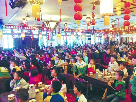 10月19日上午,来自朝阳区西坝河幼儿园300余名小朋友来到老舍茶馆品茶看戏,亲身体验独具魅力的中国传统文化和老北京茶馆文化。
