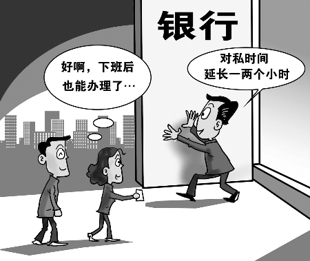前不久,银监会主席助理阎庆民在演讲时说,国外银行网点营业通常分为对公服务和对私服务时间,对公服务营业到下午5点,因为这时企业都下班了;对私服务则延长一两个小时,方便私人客户下班到银行办理业务。阎庆民认为,国内商业银行在这方面的服务存在差距。为此,他建议商业银行对私服务时间延长一两个小时,让民众可在下班后到银行处理个人金融业务。