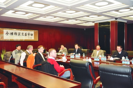 2012年12月3日,赖因哈特公司(Reinhart)董事长Thomas Reinhart、赖因哈特(北京)贸易有限公司总经理TonyGeitz、风险部经理VoronovAleksei和内贸部经理孙秀生一行四人到访全国棉花交易市场,就加强合作的有关事项进行了商谈。全国棉花交易市场董事长王正伟、副总经理杨宝富出席了会谈。图为赖因哈特公司一行与全国棉花交易市场相关领导就加强合作的有关事项进行商谈。