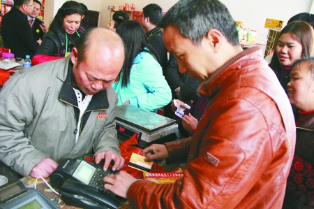 图为农户正在岳池农信社EPOS机助农取款代理点取款。