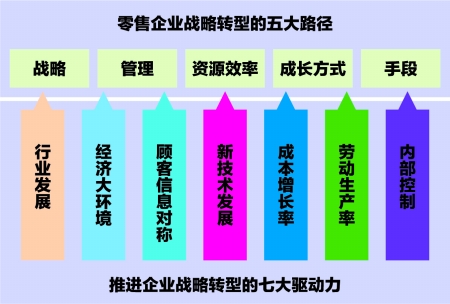 零售企业在七大驱动力下,需要从战略、管理、资源效率、成长方式、手段五个方面入手,齐头并进,全面提升,实现战略转型。