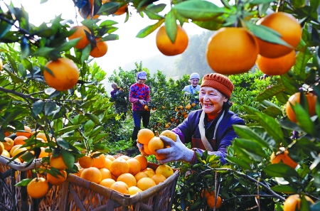 近日,四川省广安市邻水县两河乡大桥村的果农正在果园中开心地采摘直接销往重庆永辉超市的品牌水果脐橙。近年来,邻水县抓住毗邻重庆市的地域优势和盛产被农业部认证为地理标志农产品的脐橙优势,主动与重庆永辉超市、商投集团和新大兴集团等商贸企业对接,强力推进脐橙产业发展。目前,全县已建成万亩示范区8个、千亩示范园30个,脐橙种植面积达28.5万亩。今年收获脐橙10.5万吨,产值达3.6亿元,果农户均收入达5000元。