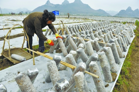 12月17日,广西壮族自治区柳城县马山乡大村的农民正在冬闲田摆放食用菌木耳棒。近年来,柳城县农业部门在马山乡大村采用“公司+基地+农户”的经营模式,发动农民在冬闲田种植黑木耳面积达150亩。目前,种植的第一批黑木耳已陆续开始采摘上市,平均日产新鲜黑木耳约3500公斤,每天收入2万多元。预计到明年4月,可生产干黑木耳75吨,产值达600多万元。