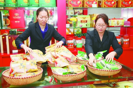 1月6日,北京市怀柔区长哨营满族乡正蓝勤业农产品产销专业合作社的社员正在销售年货。眼下,春节越来越近,该合作社销售的满族山货备受市场青睐,年糕、柏木熏肉、五谷杂粮、鲜果干、野山珍、柴鸡蛋、核桃等满族山货俏销北京市场。据了解,该合作社成立于2006年,入社社员100余户,合作社通过加工销售具有满族特色的农产品来推动合作社的发展。据了解,合作社还先后开发出了年糕、米黄、煎饼、宫廷柏木熏肉等八大系列50余个品种的满族小吃,备受市场欢迎,有效带动了社员增收致富。卜向东 摄 (cnsphoto供图)