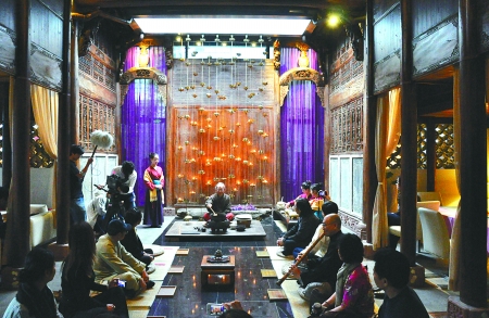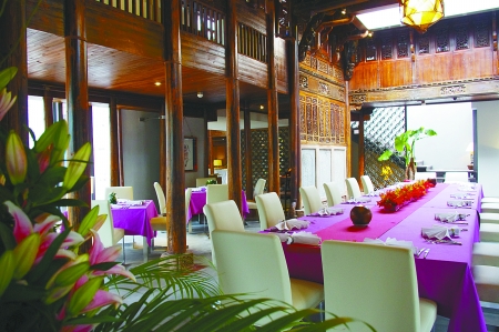 比起茶楼,紫苑更像是古代高官显贵的邸院,檐牙高啄的门楼、五步一楼的设计,处处尽显精致典雅风范。细问后才知,紫苑中不论人物走兽,还是镂空雕刻,一点一滴都来源于两座江西拆迁老房——报恩堂和千金屋。紫苑的建造沿用旧时工艺,不用一钉,完全采用榫头卡合。在保证其稳固性的同时,最大地展现了古建风貌。