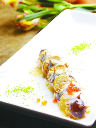 卖点:此道菜品是茶膳中的精品,选用辽东半岛的辽参。辽参富含蛋白质,具有补肾、抗癌、美容、益智、增强体力、养颜之功效,配以新鲜虾籽提鲜,最后搭配着细切的茶叶碎。食用起来具有清新口气、增强抵抗力的功效,左手边单配一杯蜀茶竹叶青,先饮竹叶青后食辽参,可助消化和解油腻。竹叶青属绿茶类,富含儿茶素和氨基酸,适合于大众人群。