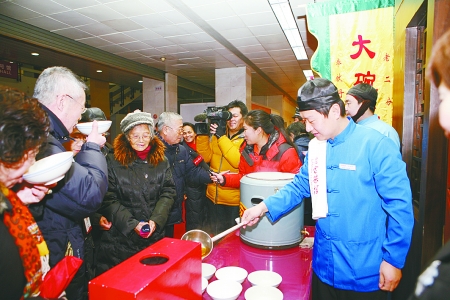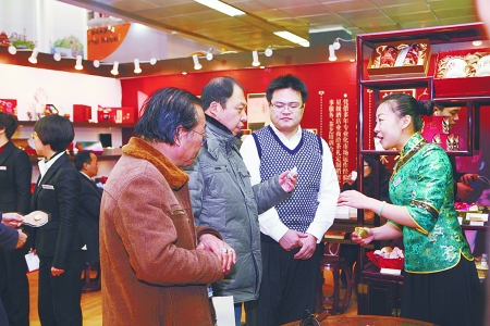 具有浓郁传统文化元素的特装展位,醒目的老舍茶馆牌匾,门前身着蓝褂、头戴黑帽、肩搭手巾把的堂倌,茉莉花香四溢的大碗茶,还有老北京叫卖吆喝声,吸引着到中国国际展览中心参观人群的目光。2012年12月28日-31日,由北京市委旅游发展委员会主办、北京市旅游协会等部门承办的首届北京旅游商品博览会在中国国际展览中心举办。