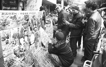 2月24日,湖南省邵阳县下花桥镇农民在市场看着图解选购花卉苗木。邵阳县30余家花木合作社不失植树种花好时机,将果木新品种结出的果实和花木绽放的花卉制成图解在市场推广,让消费者直观感受新品种的效益,备受人们欢迎。目前全县图解花木市场一派繁忙的景象,看着图解选购花木苗者络绎不绝。