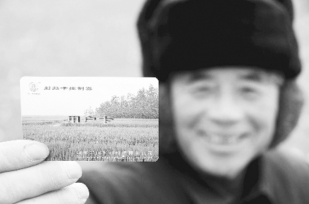 图为村民袁德信展示用于浇灌小麦的“射频卡”。