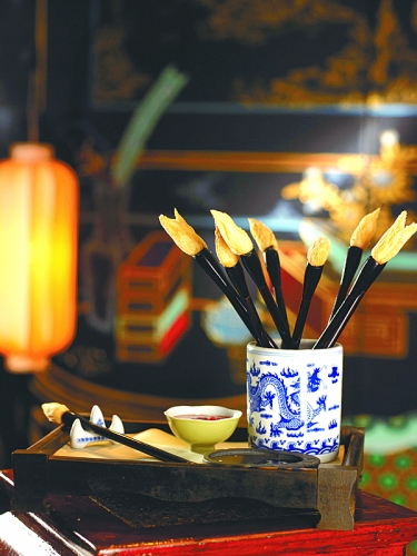 制作:先将面粉、植物油用开酥方法做成酥皮,然后切成小块,包上馅心,做成毛笔形状,用200℃油温炸即可。