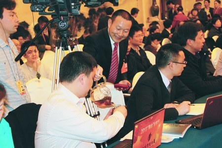 十二届全国人大一次会议河南代表团全体会议的媒体开放日上,刘文新代表为每位记者敬上一杯“信阳红”。他风趣地告诉记者们:“不到河南也可以喝上信阳红,到了河南必须要到文新茶业喝信阳红。” 炼 晨 摄