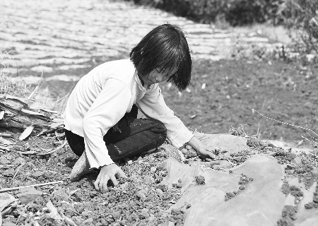 图为3月9日一名小女孩正在帮助家人采用地膜抗旱覆盖技术种植辣椒苗。