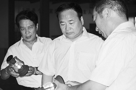 图为河南省农村信用社联合社副主任、党委委员李志刚(中)在襄城县农村信用合作联社理事长孙振甫(左)陪同下,了解产品销售情况。