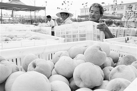 图为:7月17日,水泉镇农民将优质黄桃销售给果品加工企业。